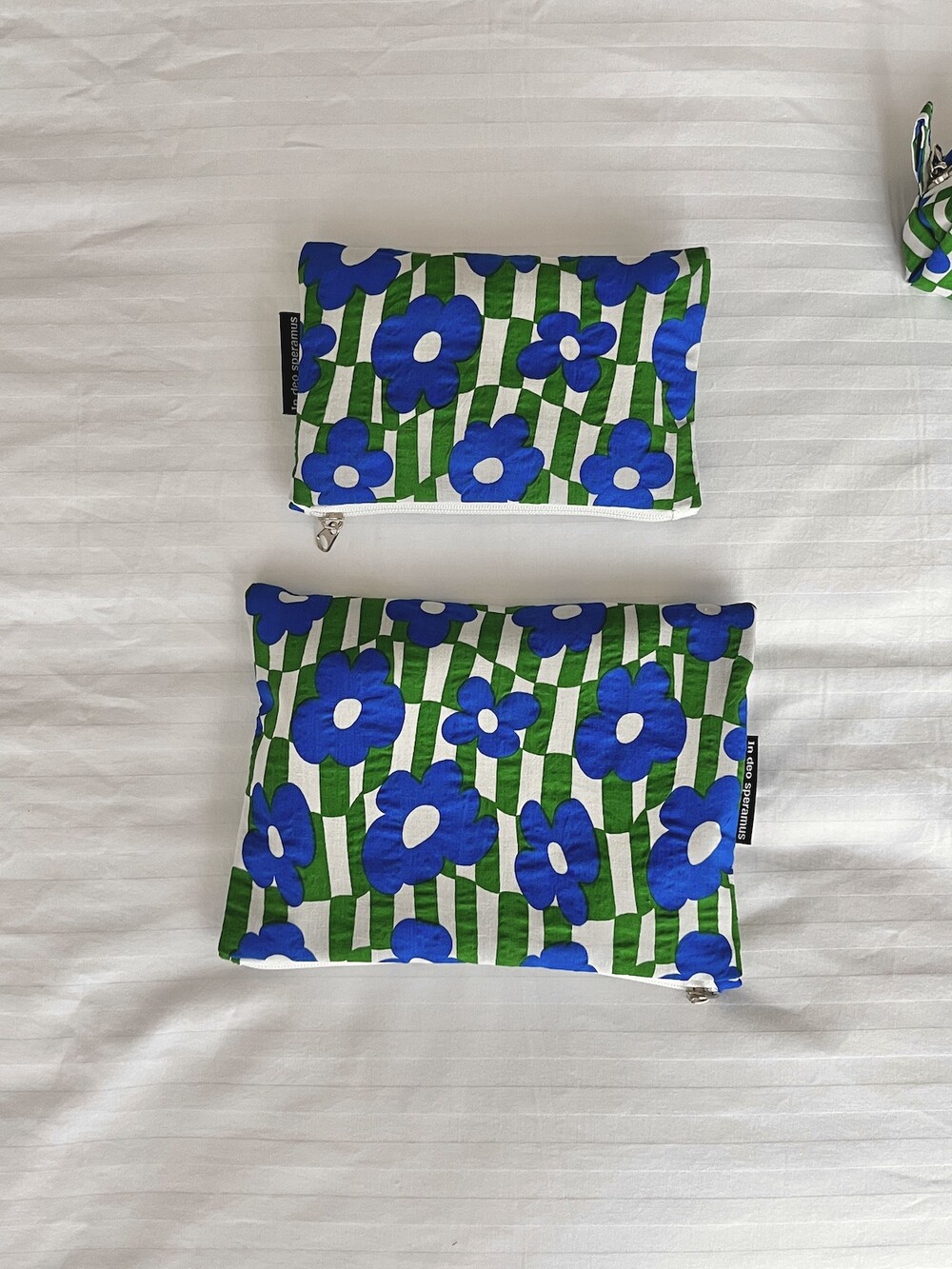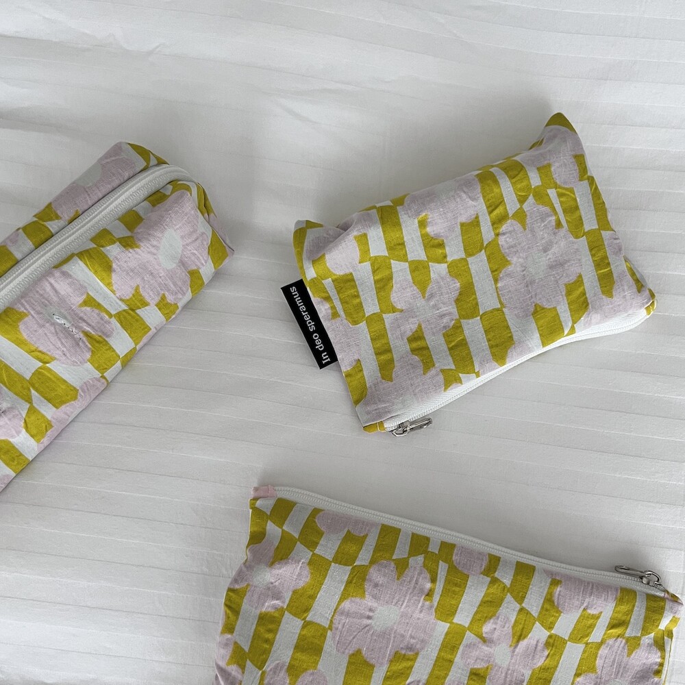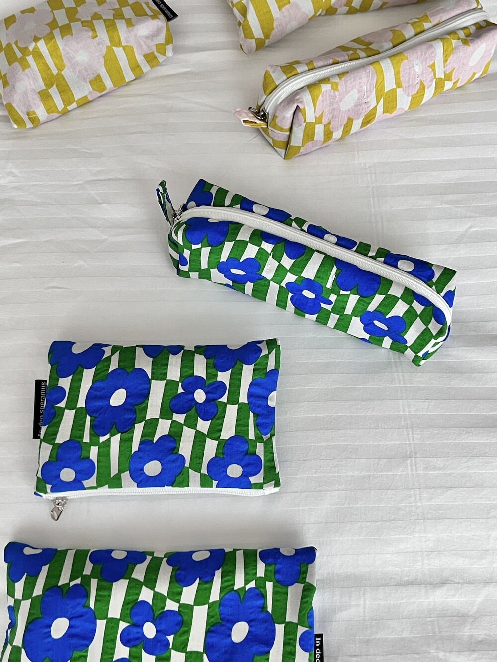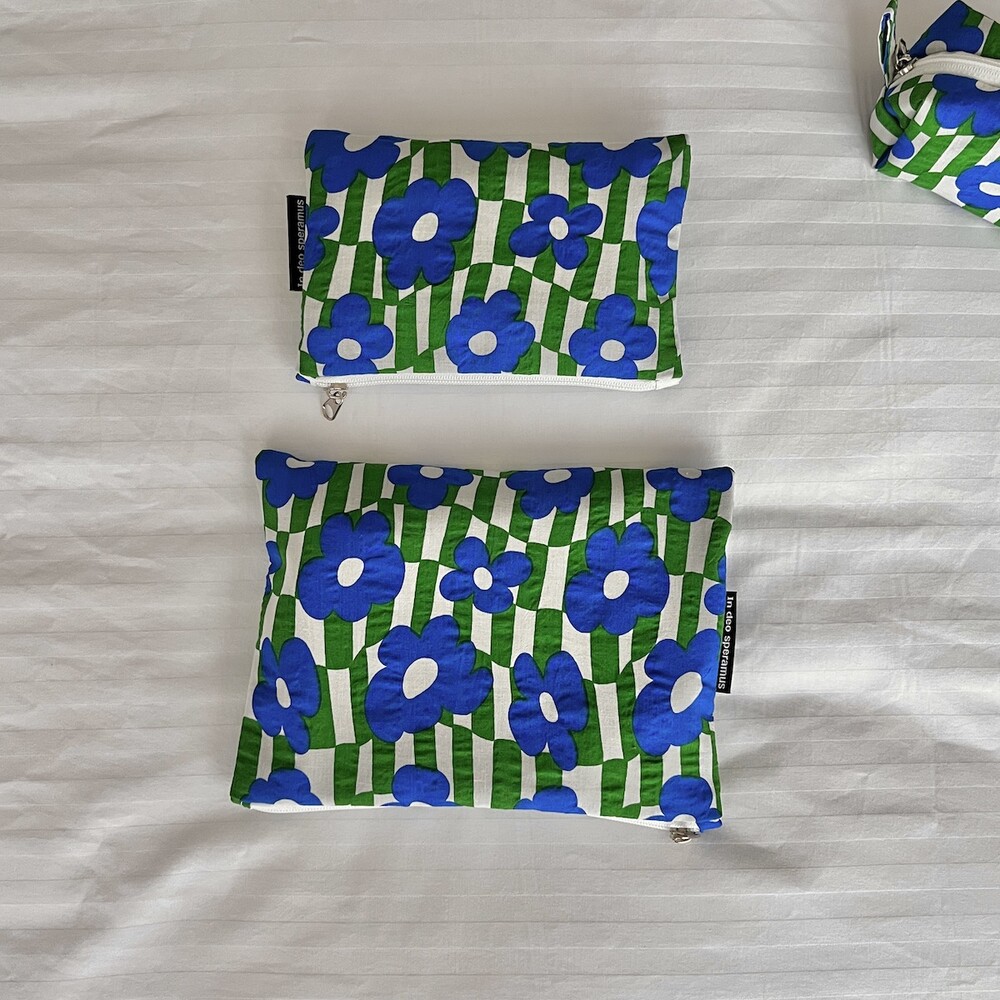 플라워 무늬 원단이 포인트가되는 패턴과 심플한 지퍼형 디자인이 매력적인 파우치입니다.