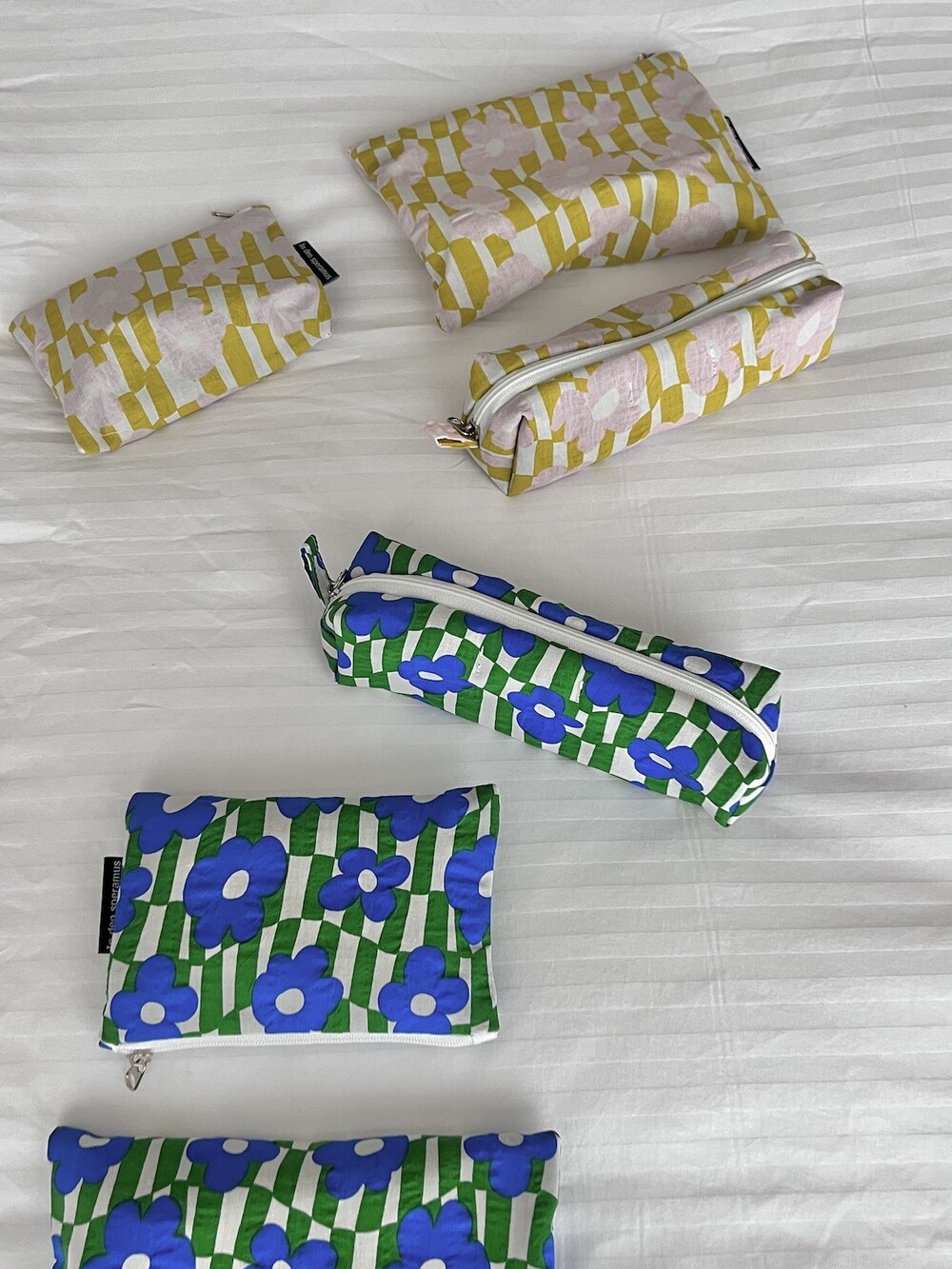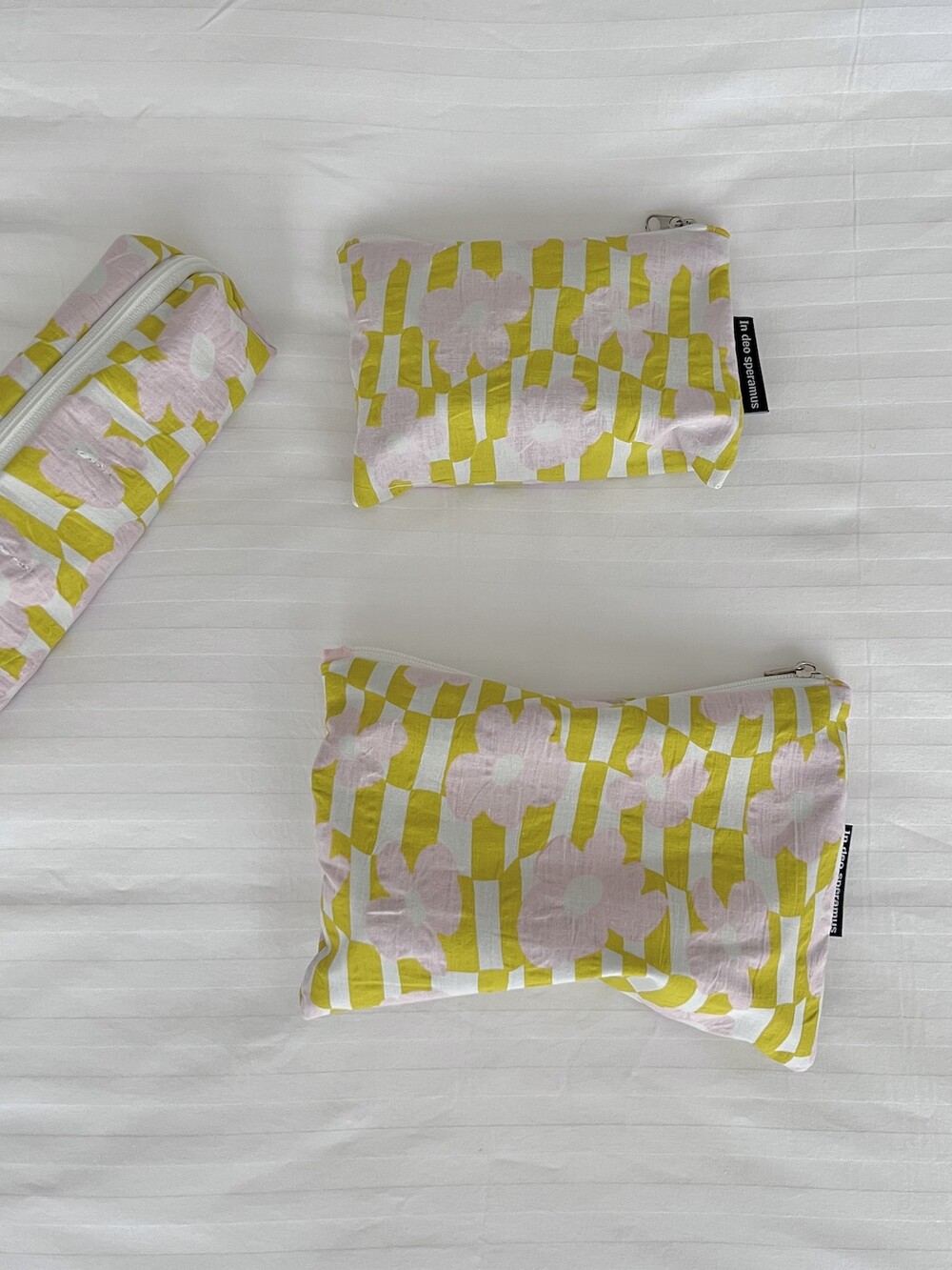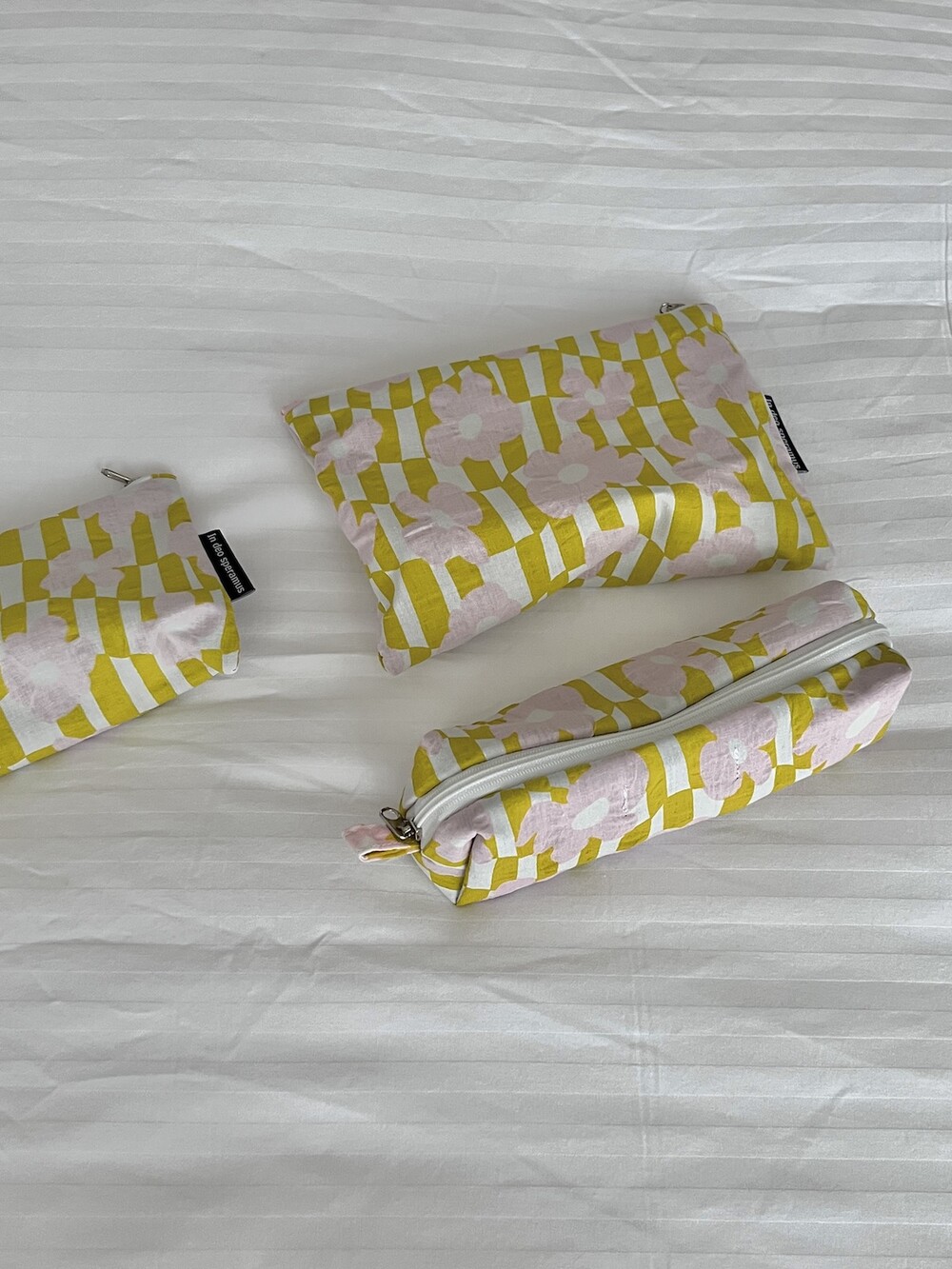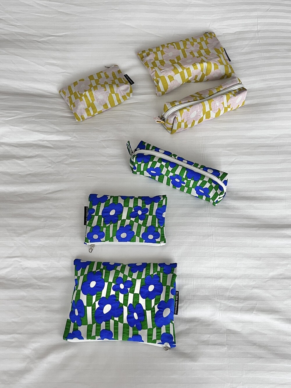 플라워 무늬 원단이 포인트가되는 패턴과 심플한 지퍼형 디자인이 매력적인 파우치입니다.